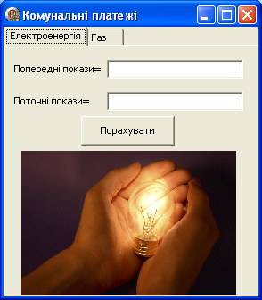 Завдання: створити програму, з допомогою якої можна було б обраховувати комунальні платежі за електроенергію, та газ. Потрібно врахувати, що тарифи за ці комунальні послуги залежать від місячної витрати кВт при оплаті за електрику і від річної витрати кубометрів при оплаті за газ.