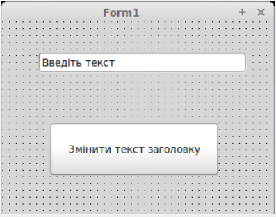 Створіть додаток, розмістіть на формі компоненти: Buton1, Edit1 так як показано на зразку. Після натискання на кнопці змінюється текст в заголовку вікна на текст введений користувачем в текстове поле.